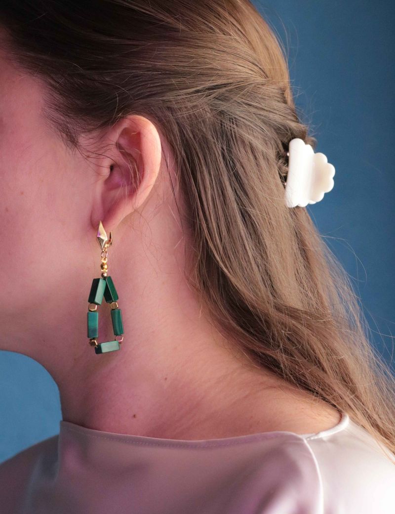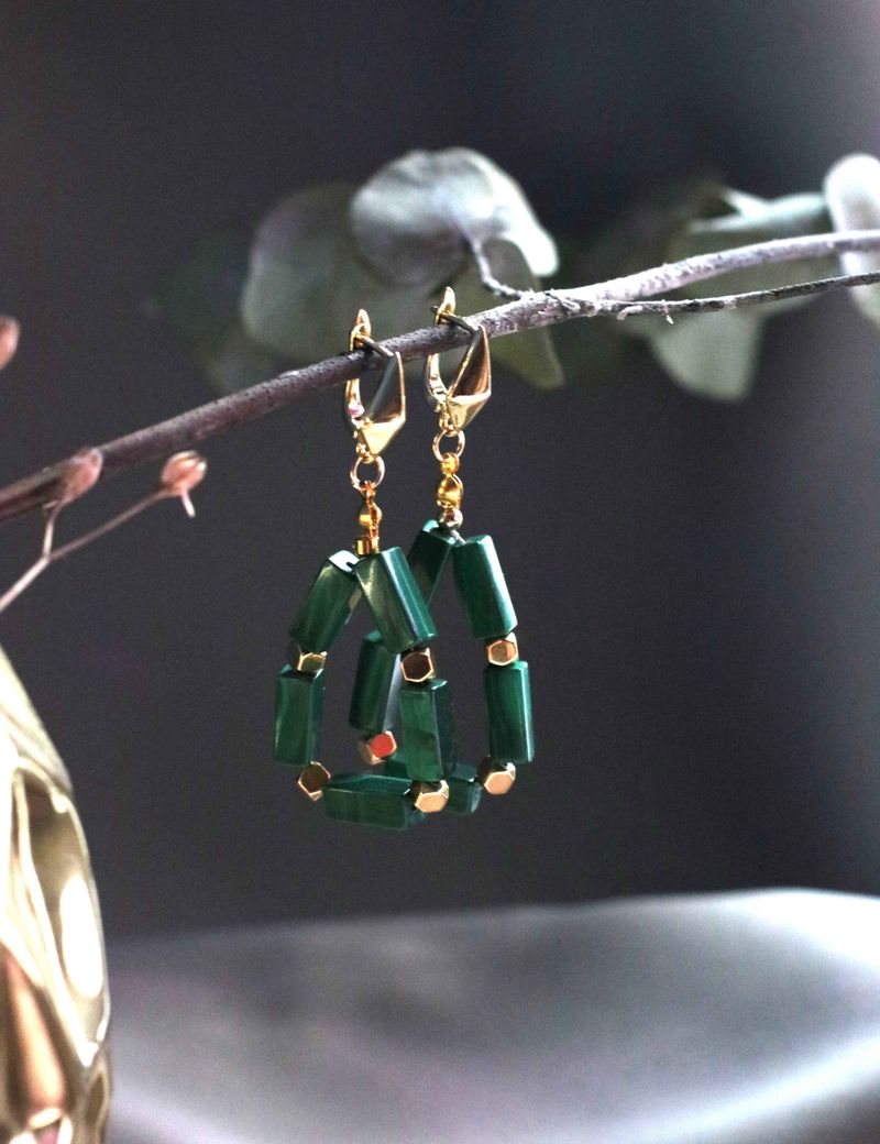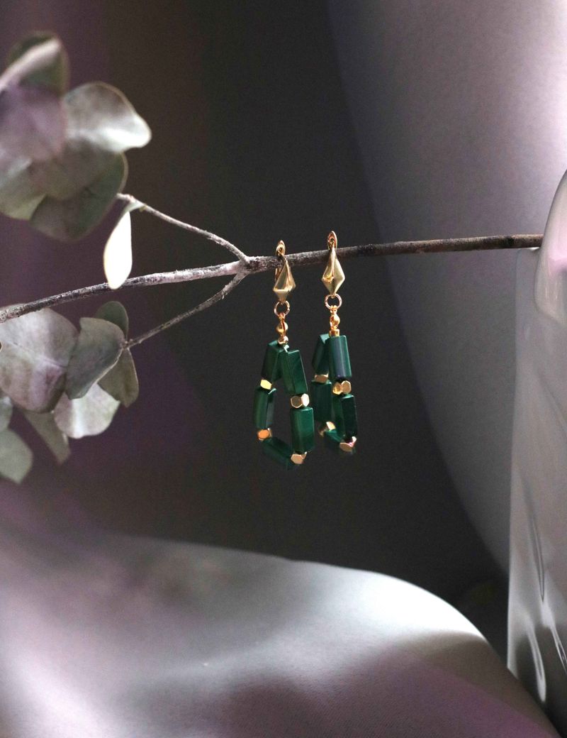 В этих серьгах использованы прямоугольные бусины малахита, их насыщенный зеленый цвет сочетается с золотистым гематином. Это сочетание природной красоты и элегантности, идеально подходящие для тех, кто ценит стильные и яркие аксессуары.