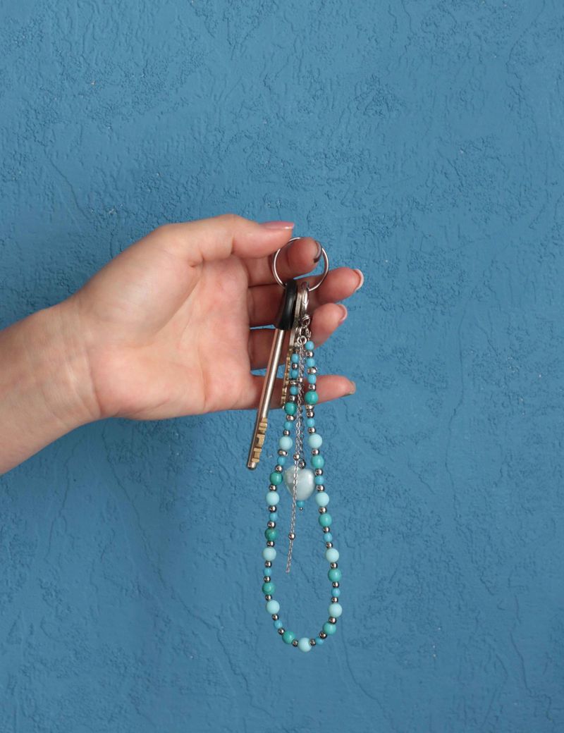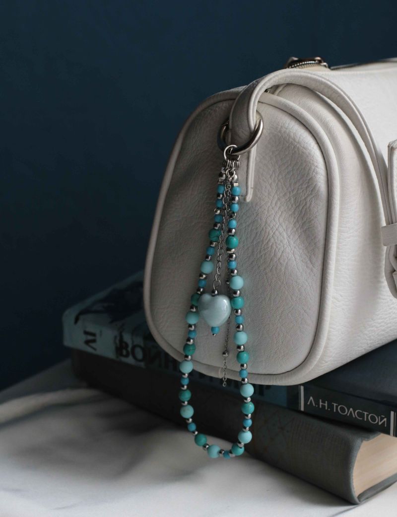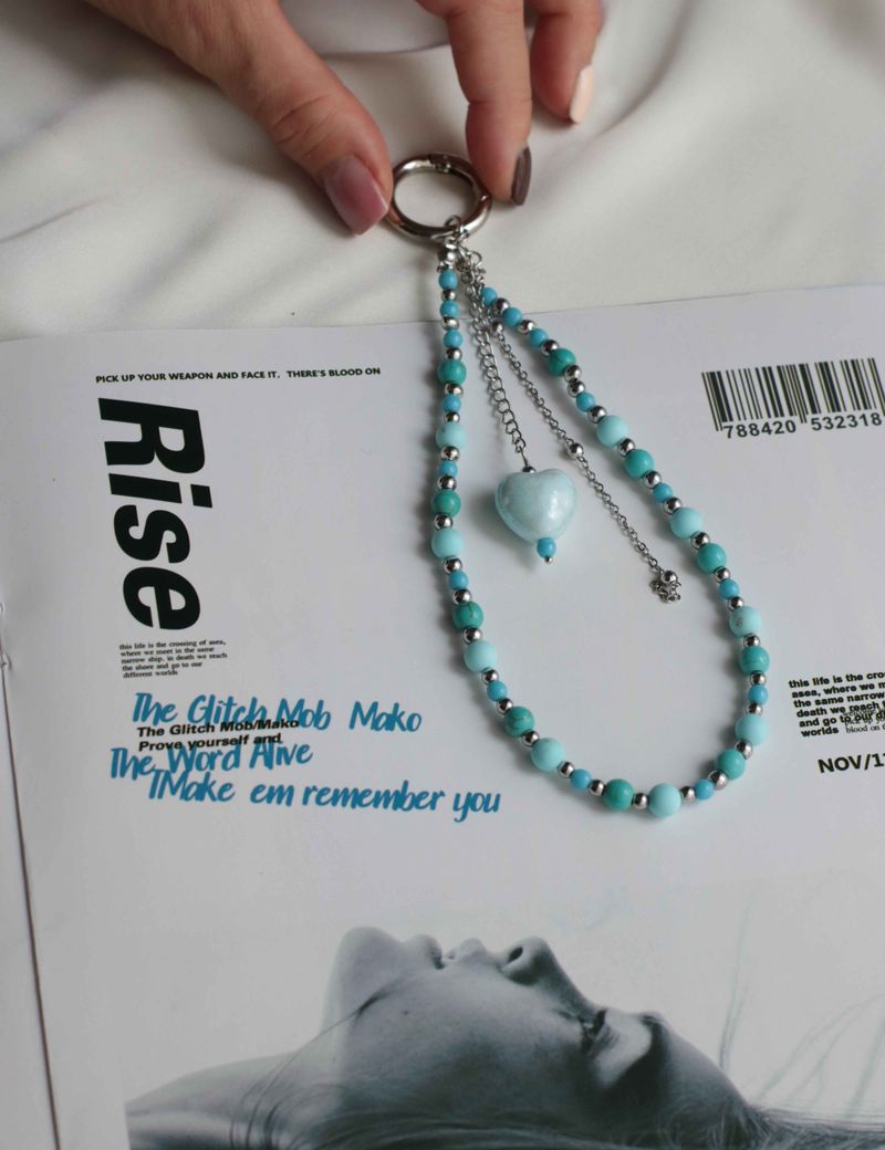 Этот яркий обвес для телефона, брелок для ключей или аксессуар для сумки станет не только стильным дополнением, но и настоящим источником положительной энергии. Составлен из нефрита, бирюзы, гематита и чешского бисера, которые создают гармоничную комбинацию цветов и текстур. Латунная цепочка и керамическое сердечко в центре завершают общий вид. Этот аксессуар украсит ваш повседневный стиль и будет приносить радость каждый день.