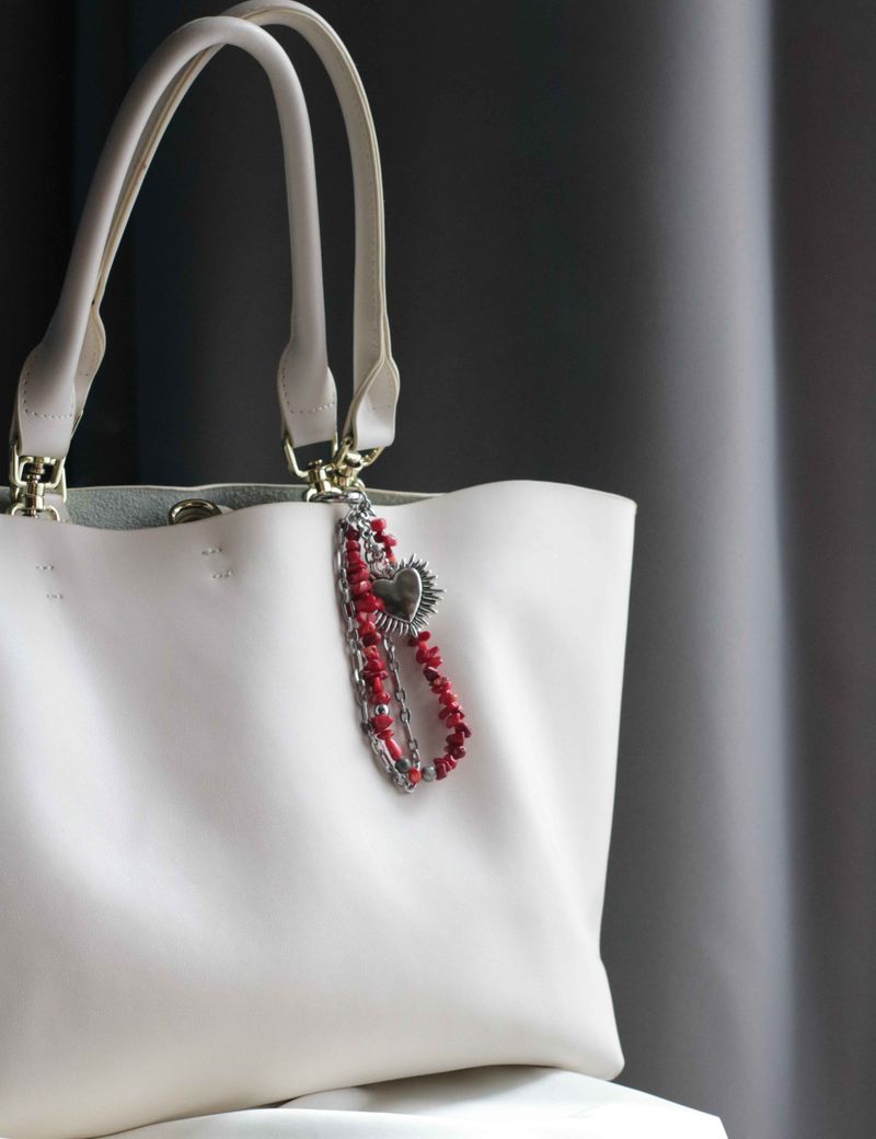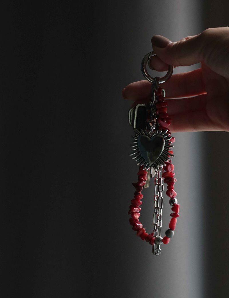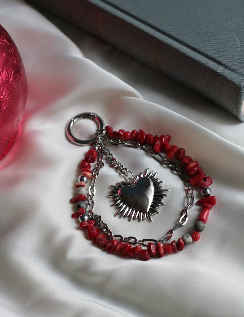 Брелок из коралла, гематита и серой яшмы с латунной цепочкой и подвеской в виде сердца. Яркие камни контрастируют с металлом, создавая интересный акцент. Лёгкий и удобный аксессуар для ключей, сумки или даже телефона!