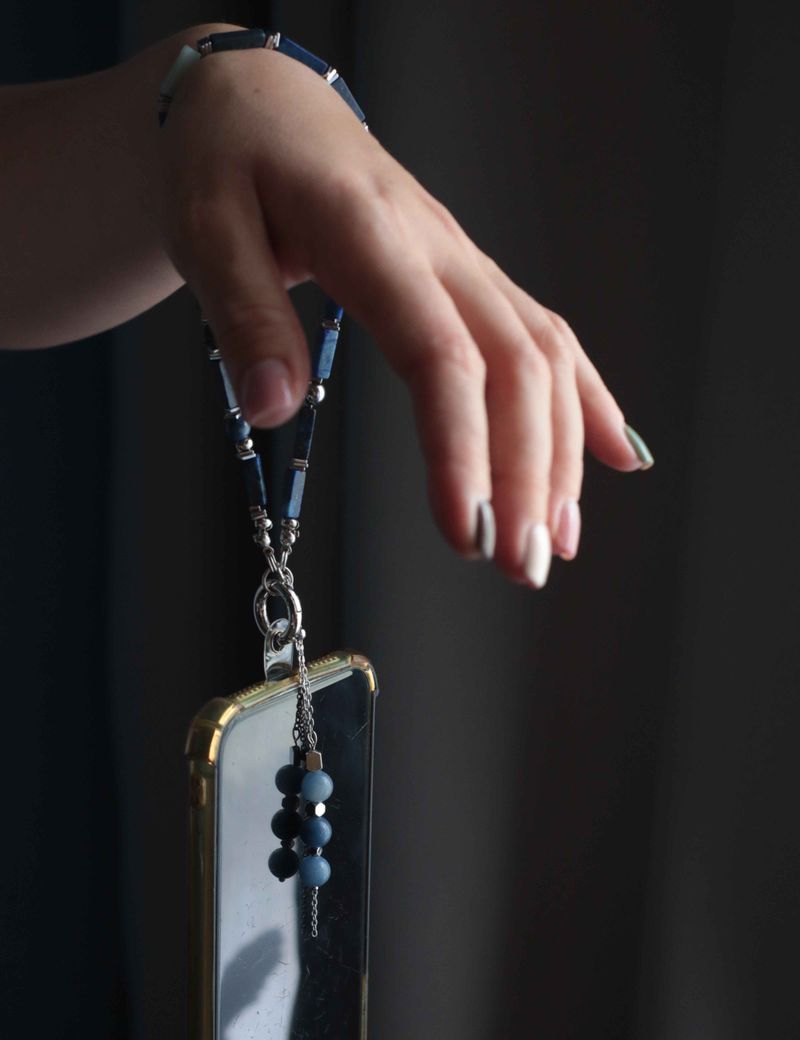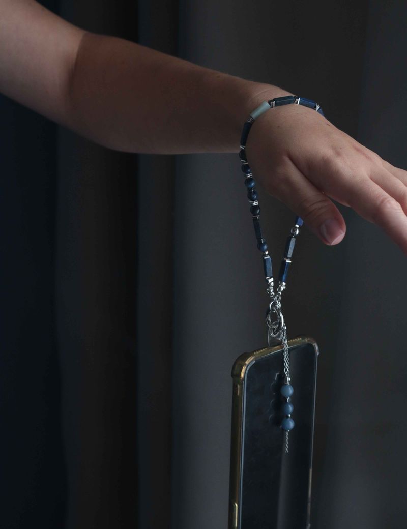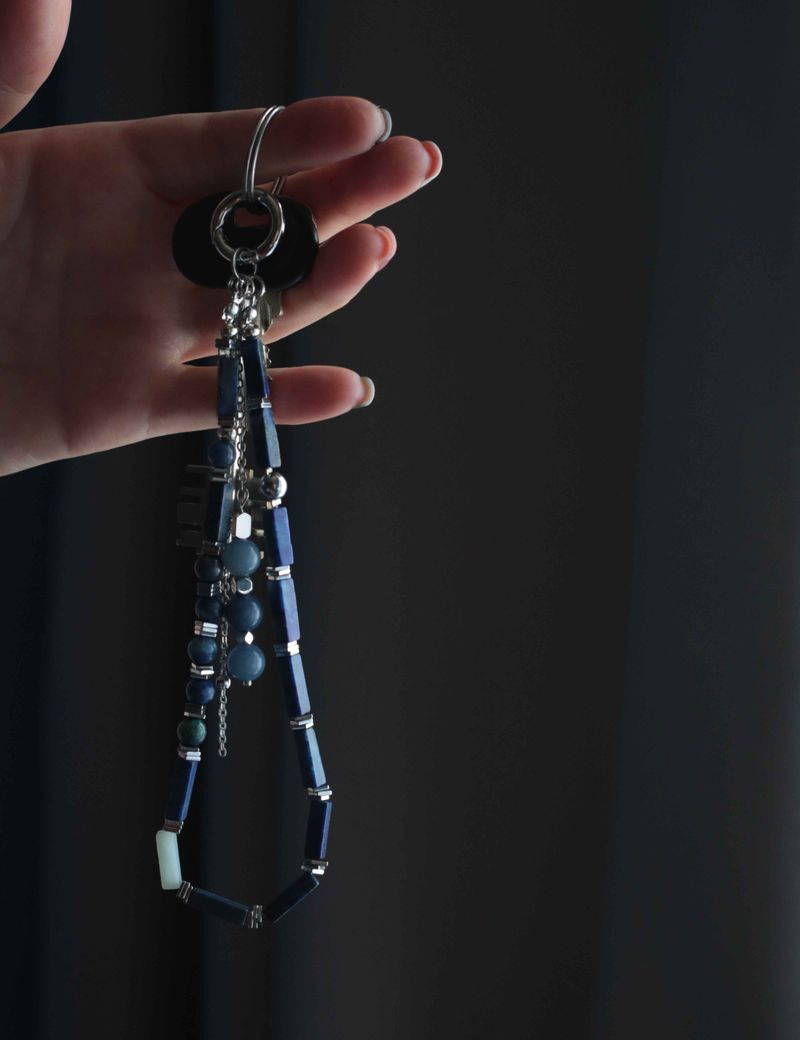 Брелок из лазурита, ларимара и гематита — идеальный аксессуар для телефона, ключей или сумки. Камни создают удивительное сочетание синего и голубого, а гематит добавляет элегантности и контраста. Лёгкий, но в то же время яркий и заметный, этот брелок станет стильным дополнением твоего повседневного образа. Удобный и функциональный, он не только украшает, но и помогает не потерять ключи или телефон.