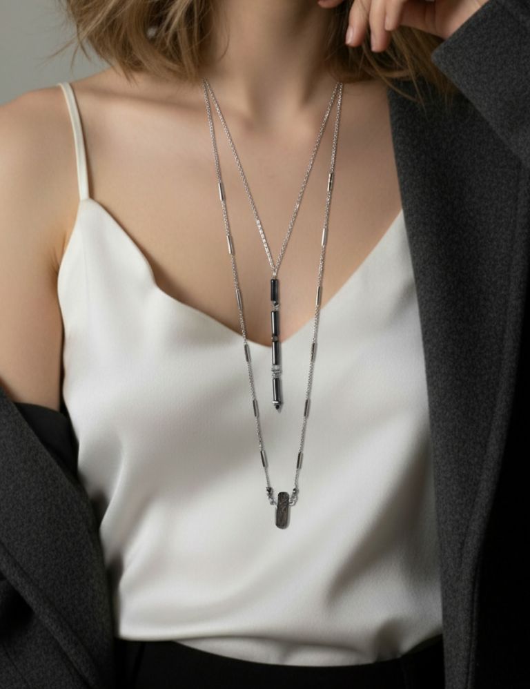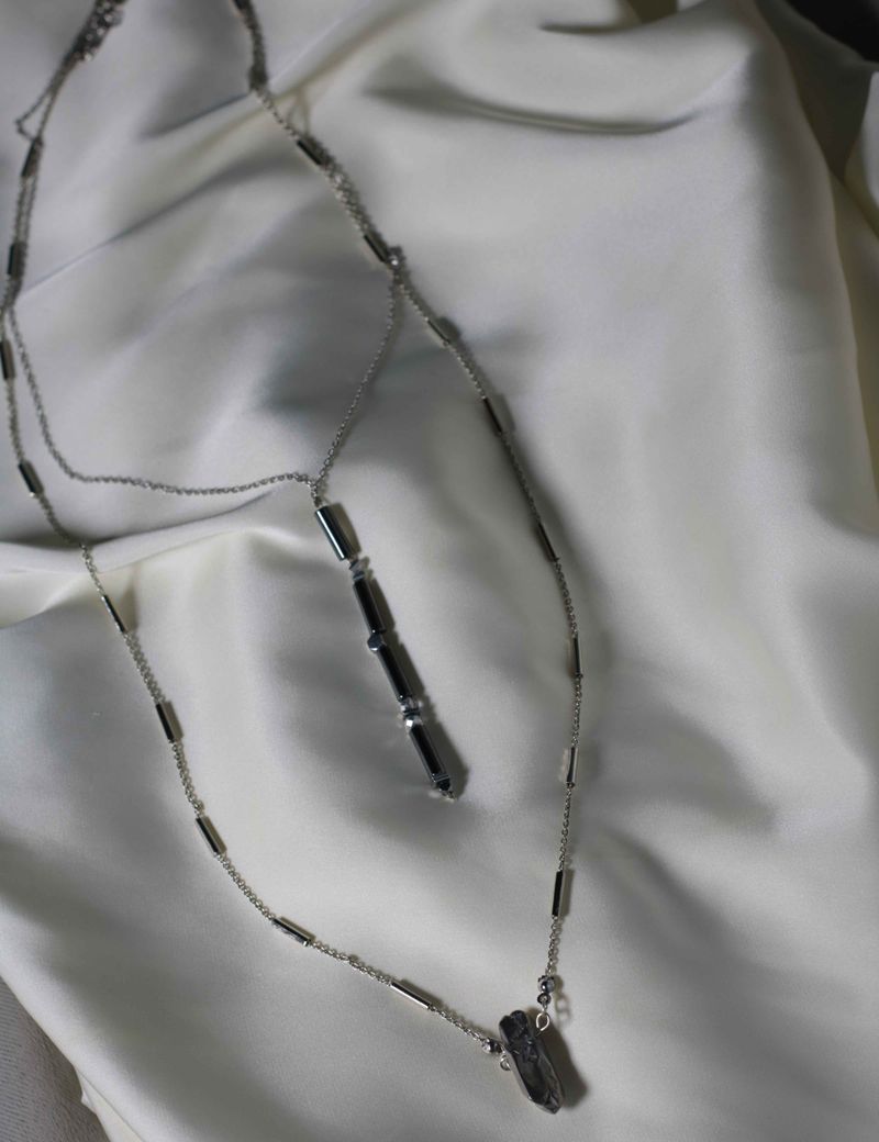 Два сотуара, которые красиво ложатся в слой и так же хорошо выглядят по отдельности. Первый — покороче: тонкая латунная цепочка и длинная подвеска-«линия» из гематина и алмазного стекла. Строгая форма и чистый блеск — то, что нужно, чтобы собрать образ без лишних усилий. Второй — на тонкой цепочке с бусиной тонированного горного хрусталя. Лёгкая прозрачность добавляет мягкого свечения и не спорит с вашим гардеробом. Носите вместе для выразительного слоя или меняйте по настроению. Один комплект — сразу несколько вариантов на каждый день и вечер.