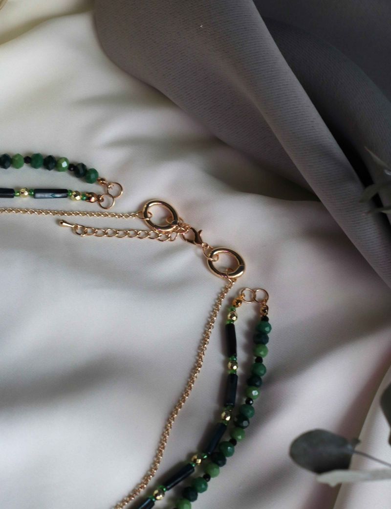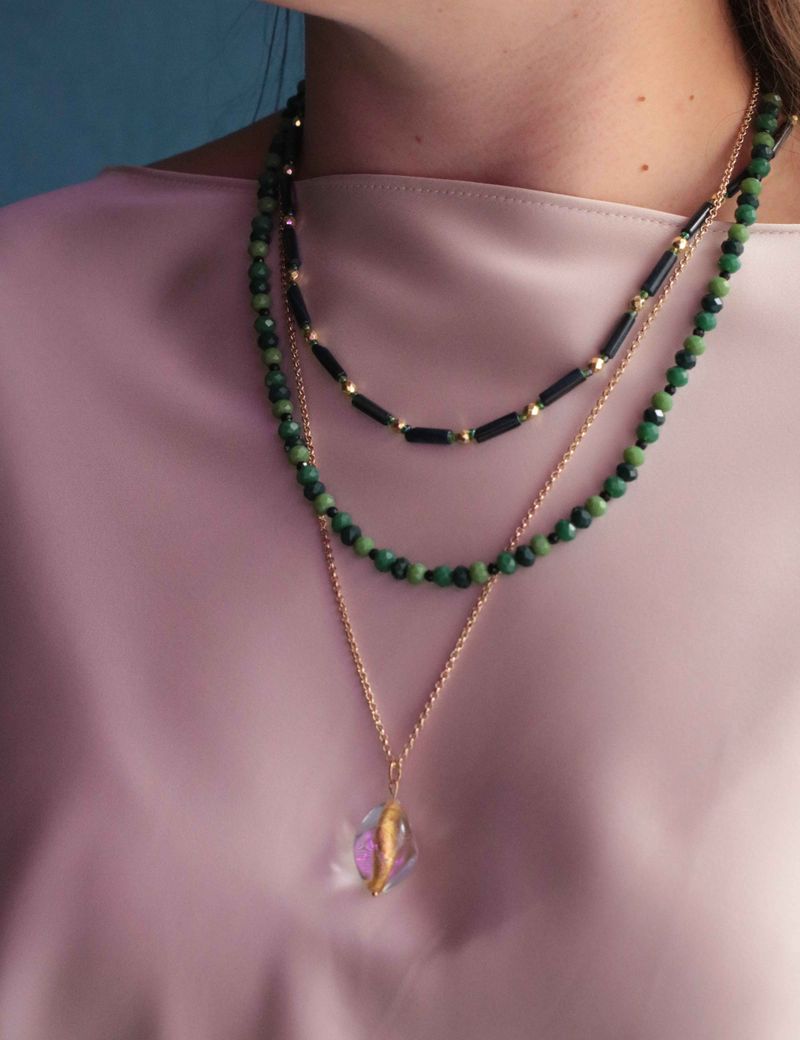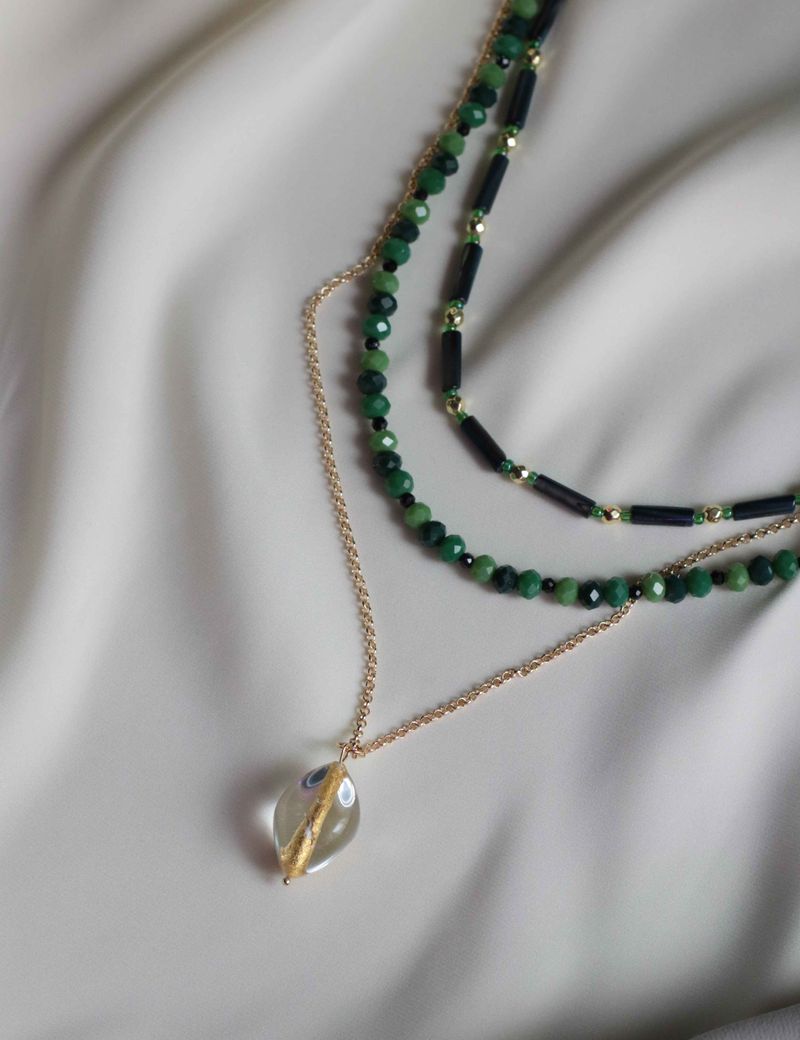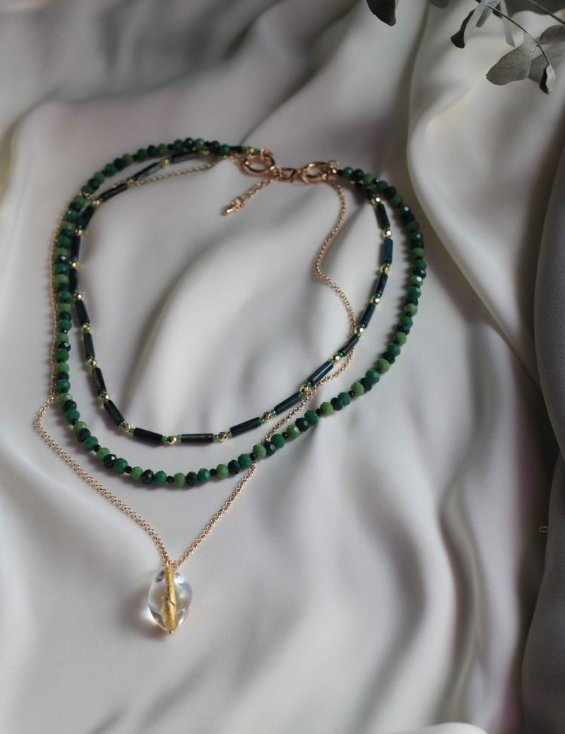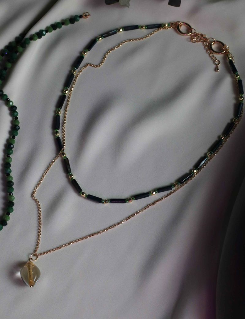 Это колье из трех ярусов — поистине уникальный аксессуар. Первый слой включает в себя бусины синего перламутра, дополненные золотистым гематитом и ярким зеленым чешским бисером. Второй слой представляет собой элегантное сочетание граненых стеклянных бусин разных оттенков зеленого и обсидиана. Третий слой — это цепочка из бижутерного сплава с позолотой 18k, на которой висит венецианская бусина ручной работы с золотистой фольгой внутри. Каждый слой этого колье можно носить отдельно, создавая минималистичный образ, или комбинировать их в любом сочетании — все вместе, по два слоя или даже один, в зависимости от вашего настроения и образа. Этот аксессуар идеально подойдёт для тех, кто любит выделяться и подчеркивать свою индивидуальность.