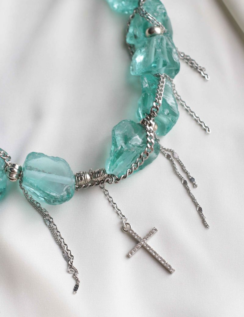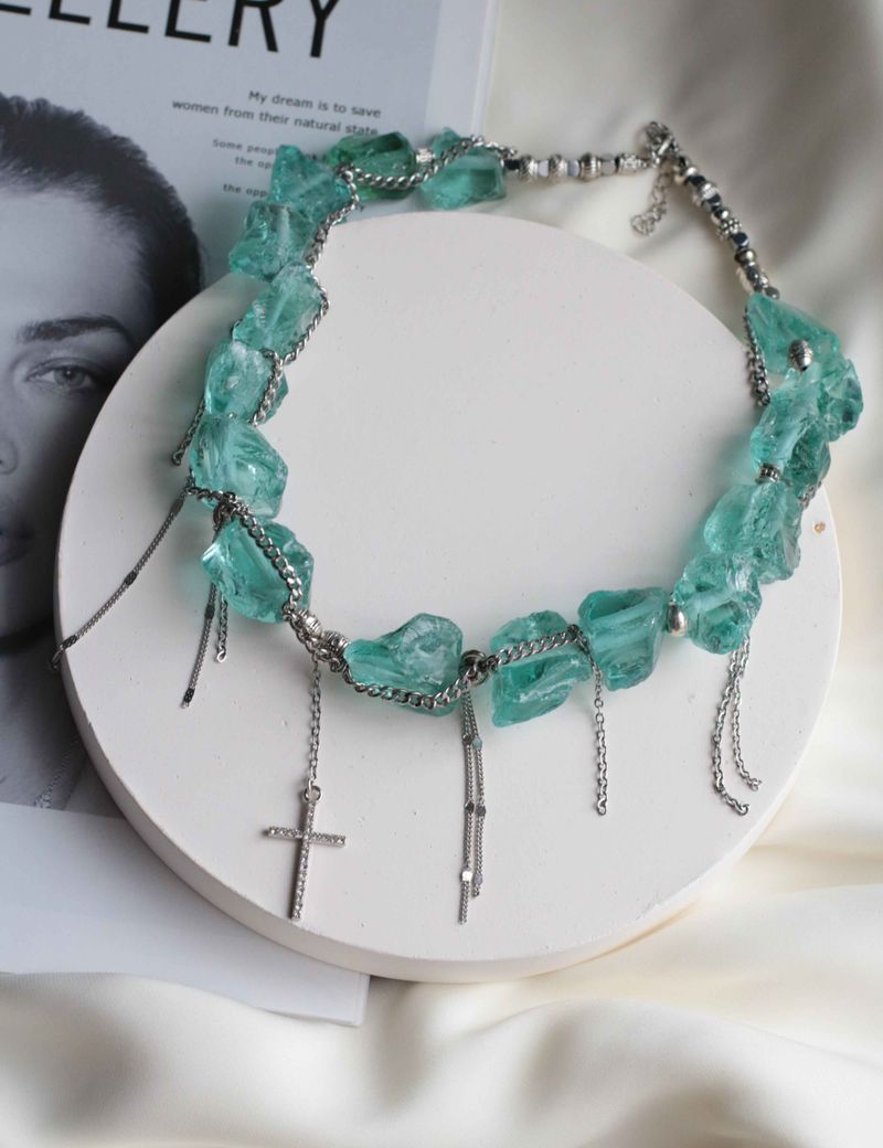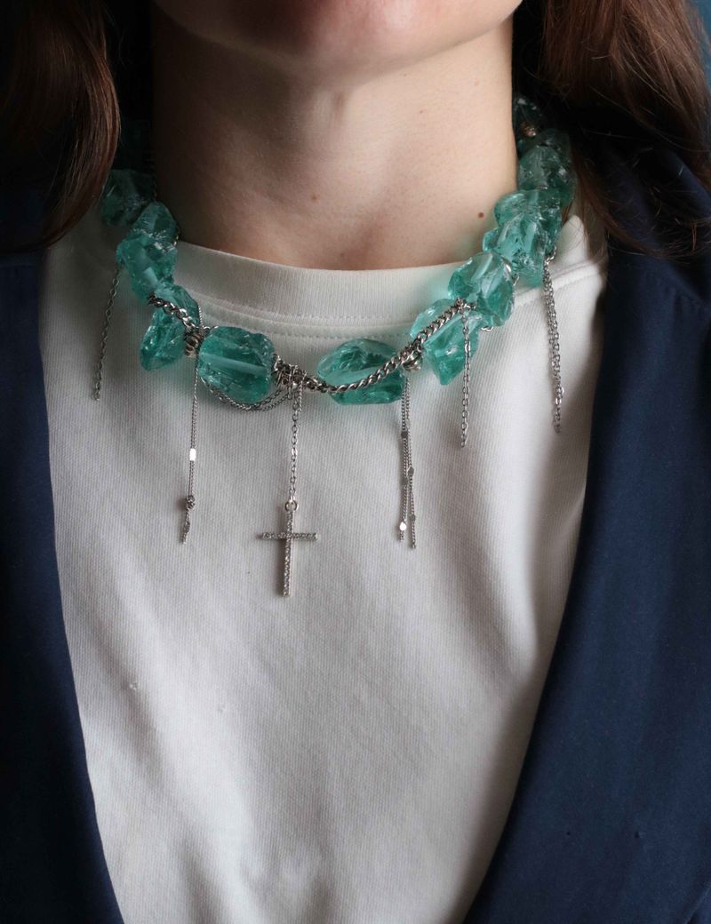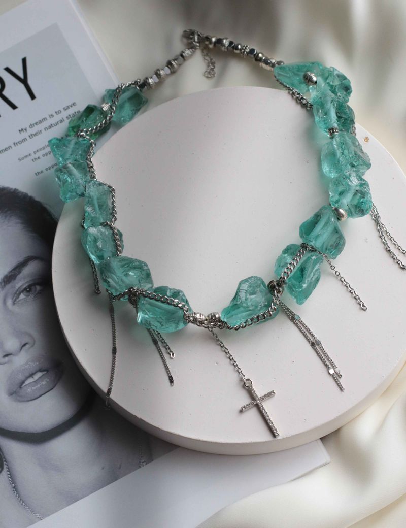 Переведи это текст: Это яркое колье с колотыми бирюзовыми бусинами, гематином и латунными цепочками станет идеальным аксессуаром для мероприятия. Уникальная текстура стеклянных элементов придает ему особую выразительность, а сочетание гематина и металлических бусин с цепочками создает интересный контраст. Такое колье точно привлечет внимание и подчеркнет любой стиль.