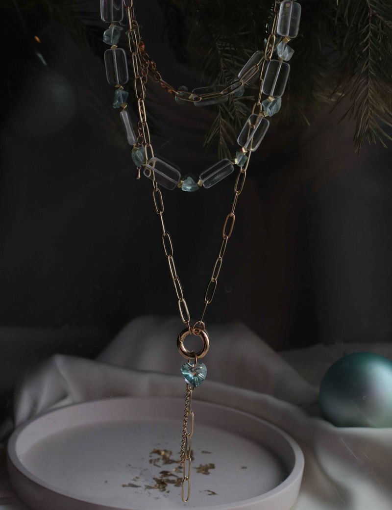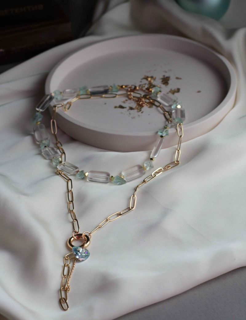 Этот комплект — как лёгкий аккорд в вашем образе. Чокер из стеклянных бусин и нежного тонированного стекла играет светом и тенями, а золотистый гематин добавляет немного блеска, не перегружая. Колье с подвеской в виде голубого сердечка и цепочками выглядит стильно. Он как маленький акцент, который придаст вашему стилю завершённость.