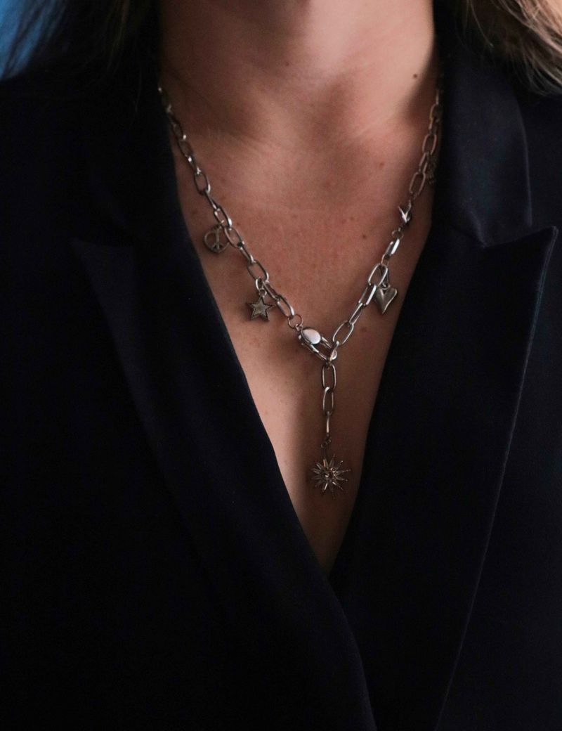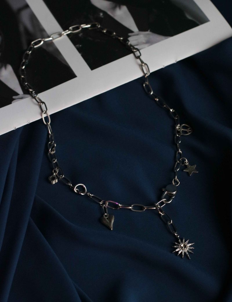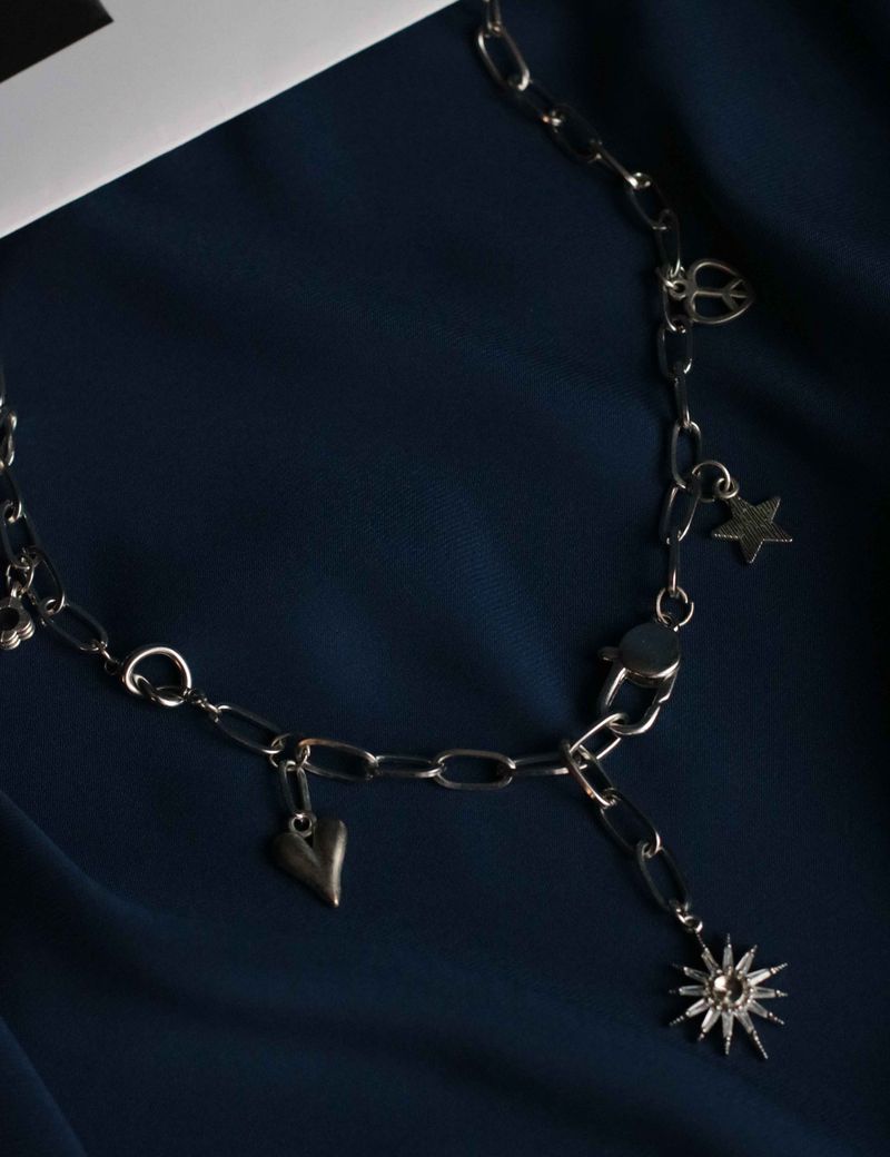 Это колье с латунной цепочкой, на которой висят подвески с разными символами: звезды, сердце, знак мира, а в центре — подвеска в виде солнца. Она выглядит как настоящий акцент на шее. Длина регулируется с помощью удобного карабина, так что вы можете настроить его под любой стиль — от более короткого до более длинного, в зависимости от настроения или наряда. Это украшение легко впишется в ваш повседневный стиль или добавит изюминку на вечер.