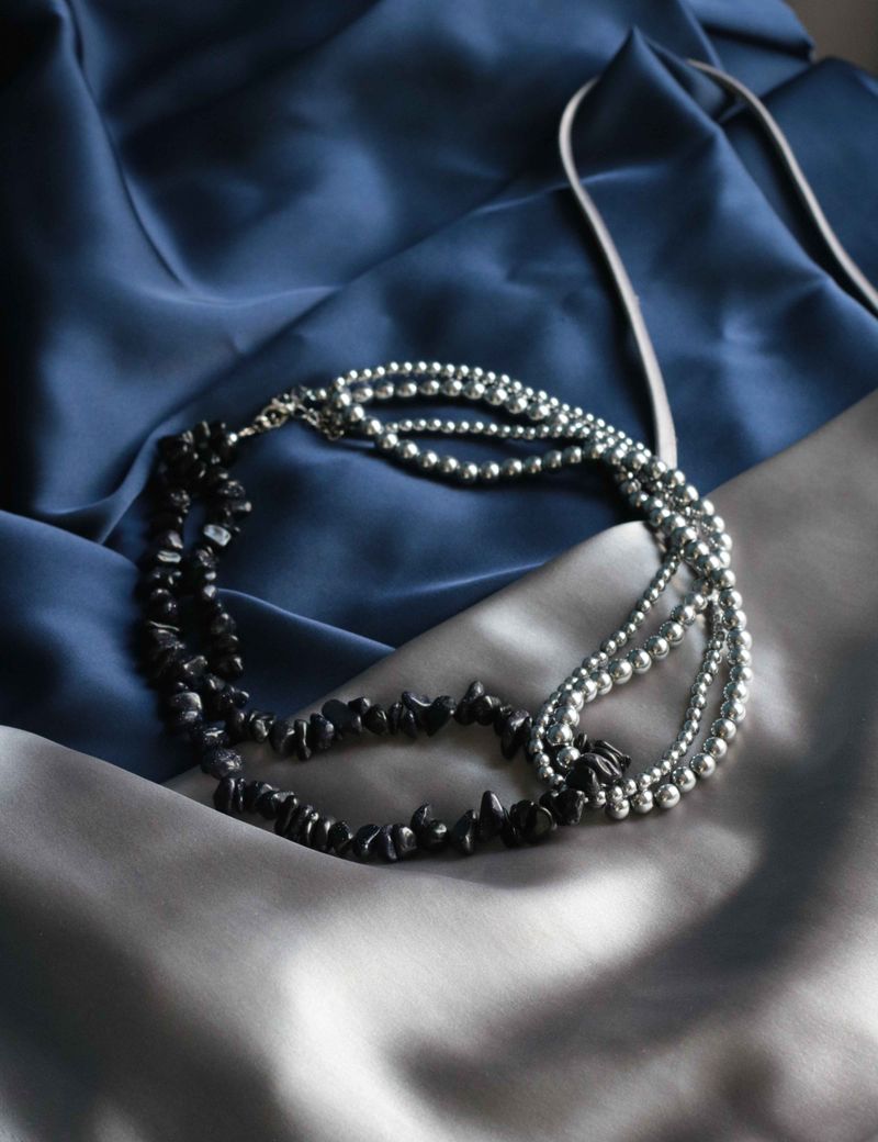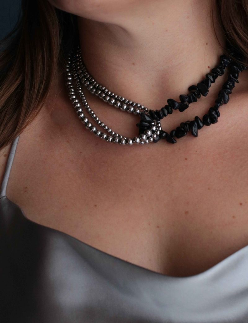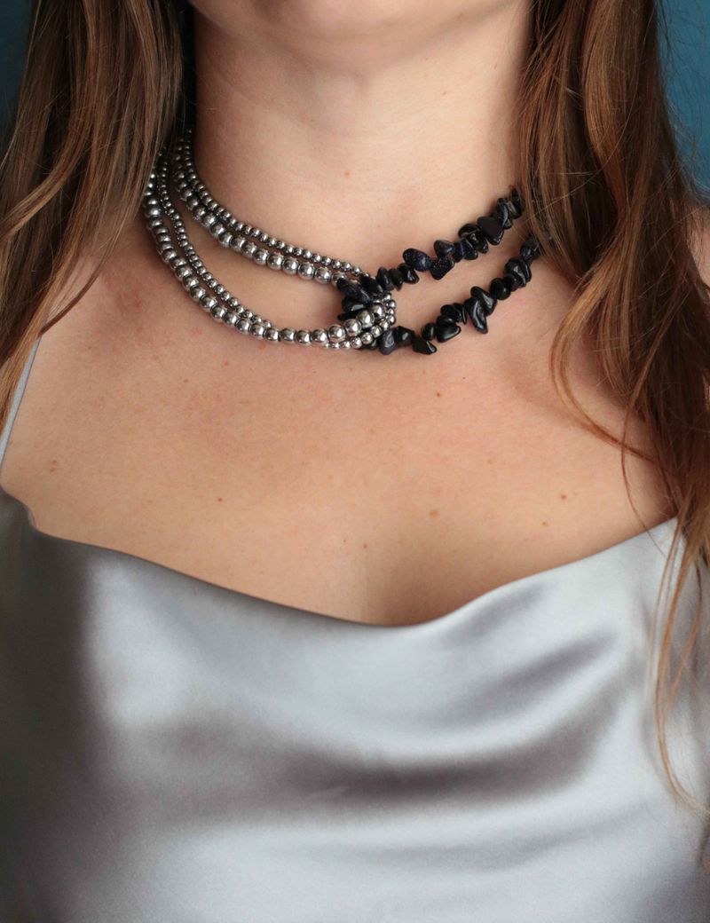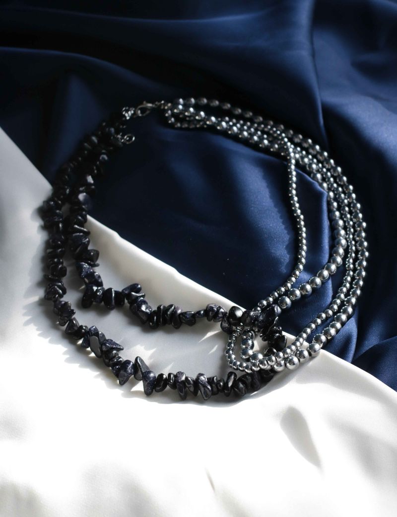Это колье — словно кусочек ночного неба, в котором переплетаются серебристый гематит и искрящийся темно-синий обсидиан. Камни излучают особую магию, играя на свету и создавая впечатление загадочного сияния. Это колье будет идеально сочетаться с вечерними нарядами, добавляя вашему образу глубины и индивидуальности.