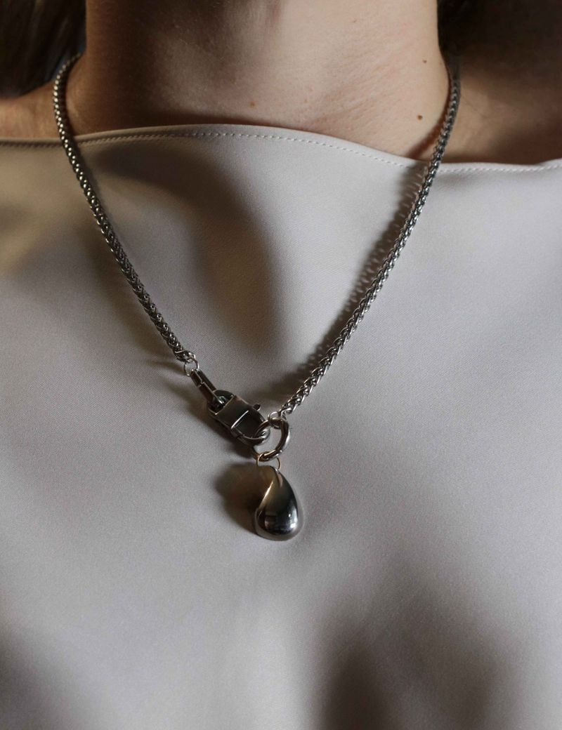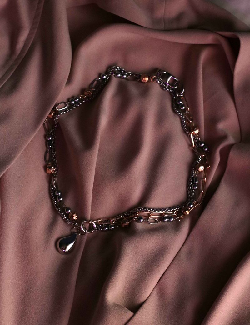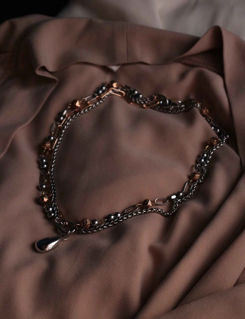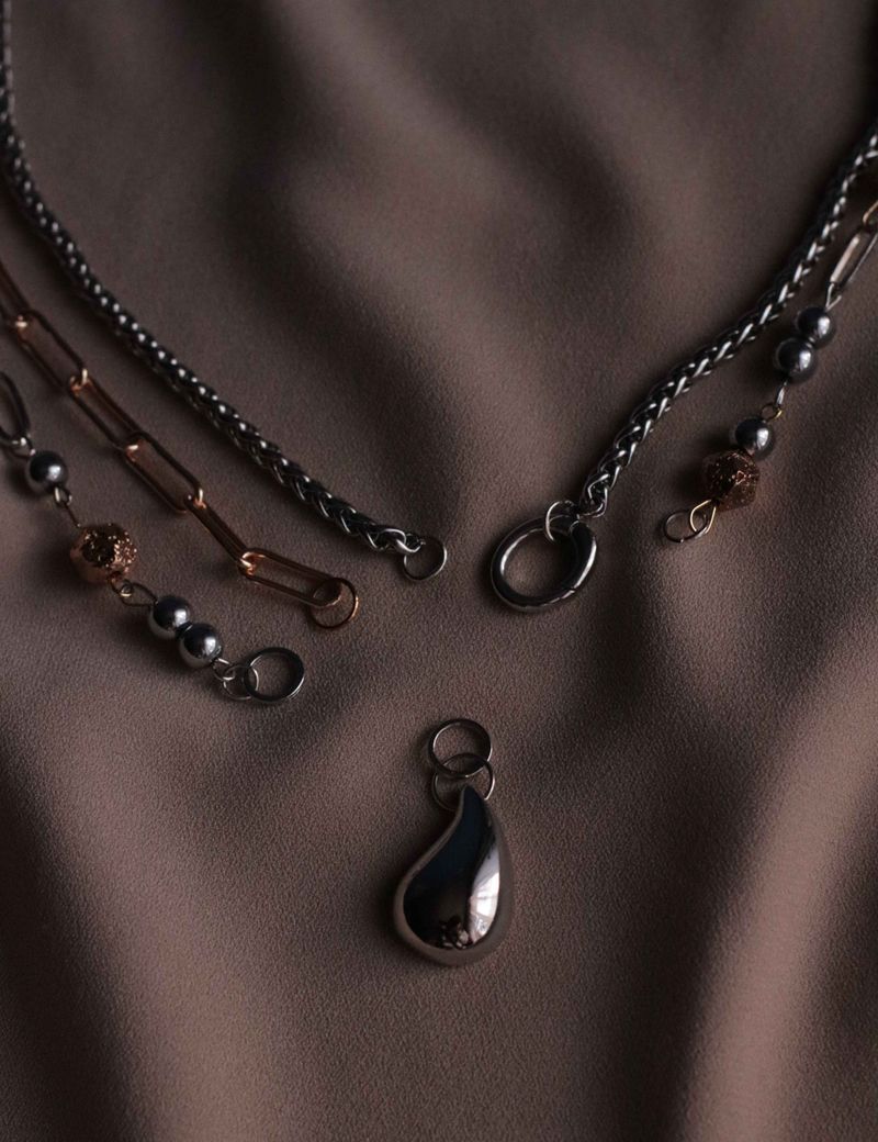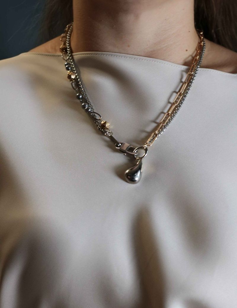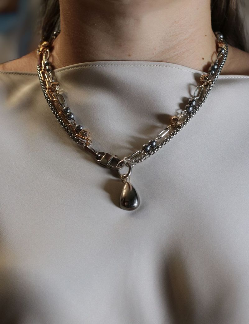 Это колье состоит из массивной цепочки из нержавеющей стали с обеих сторон, которую легко можно комбинировать с более тонкими цепочками: золотой и с гематином. Все цепочки соединены карабинами, которые служат и застежками. А центральный карабин украшается стильной подвеской в виде капли, которую тоже можно снять, чтобы изменить образ. Это колье многослойное, и каждый слой можно менять, создавая новые комбинации (смотрите варианты комбинаций на фото). Сочетание золотого и серебряного делает его трендовым аксессуаром, который легко впишется в любой стиль. Ты можешь надевать и снимать элементы, чтобы каждый раз находить что-то новое и подходящее под твой настрой. Весьма универсальный и стильный выбор!